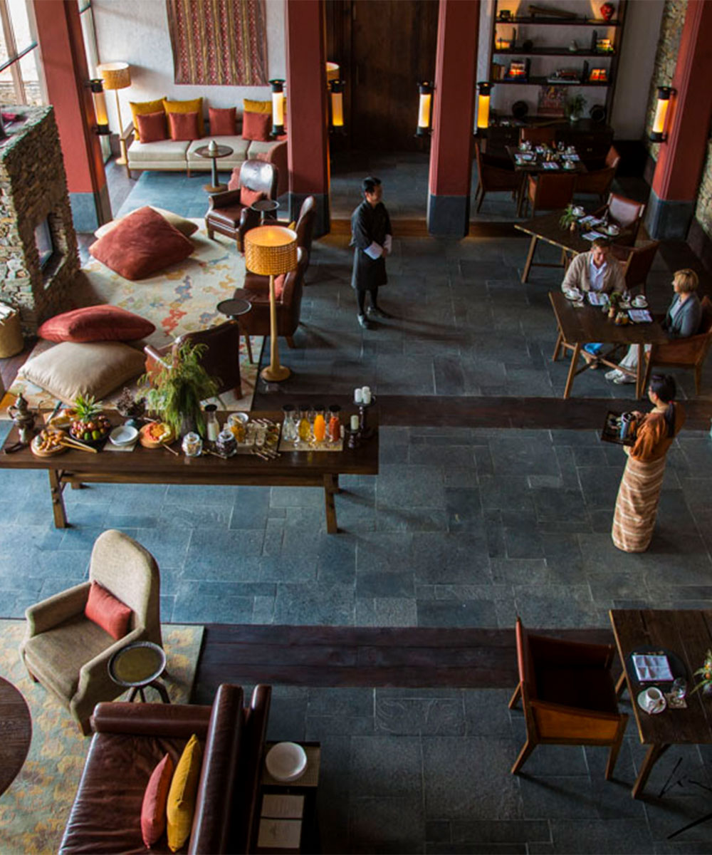The lodge’s architecture and interiors reflect Bhutanese craftsmanship and contemporary comfort in equal measure. Floor-to-ceiling windows frame the mountains, while carved wooden details, hand-painted murals and layered textiles add warmth and character. Suites feel both expansive and cocooning, with log fires, earthy tones and carefully curated furnishings creating a sense of serene indulgence. Communal spaces boast soaring wooden ceilings, intricate stonework and panoramic views that invite lingering.