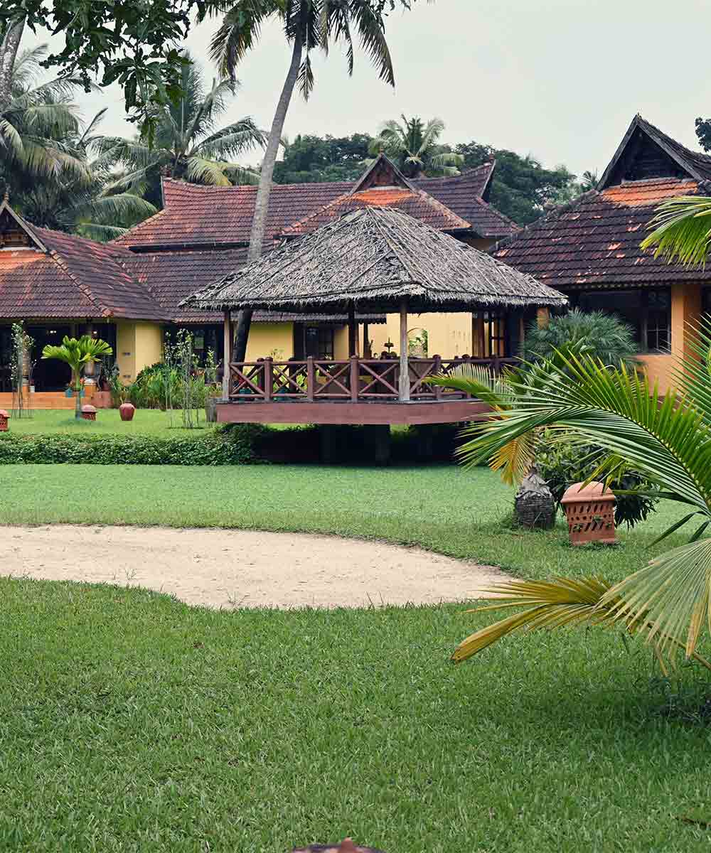 Topical gardens with lush lawns surround Ameya, an intimate property in Kerala’s backwaters.