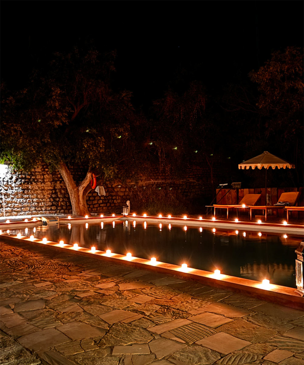 Meals are freshly prepared traditional dishes using locally sourced ingredients and served in the arched stone dining room, our outside under the dark star-lit skies. The ancient walls of the building encircle the inner courtyard, their warm stone providing an idyllic backdrop to the vast outdoor pool. Serenity here seeps into your soul as you wander the stone paths of the hotel, relax in the shade of the trees or head out to explore the plethora of local temples and snapshots of rural life in Rajasthan.