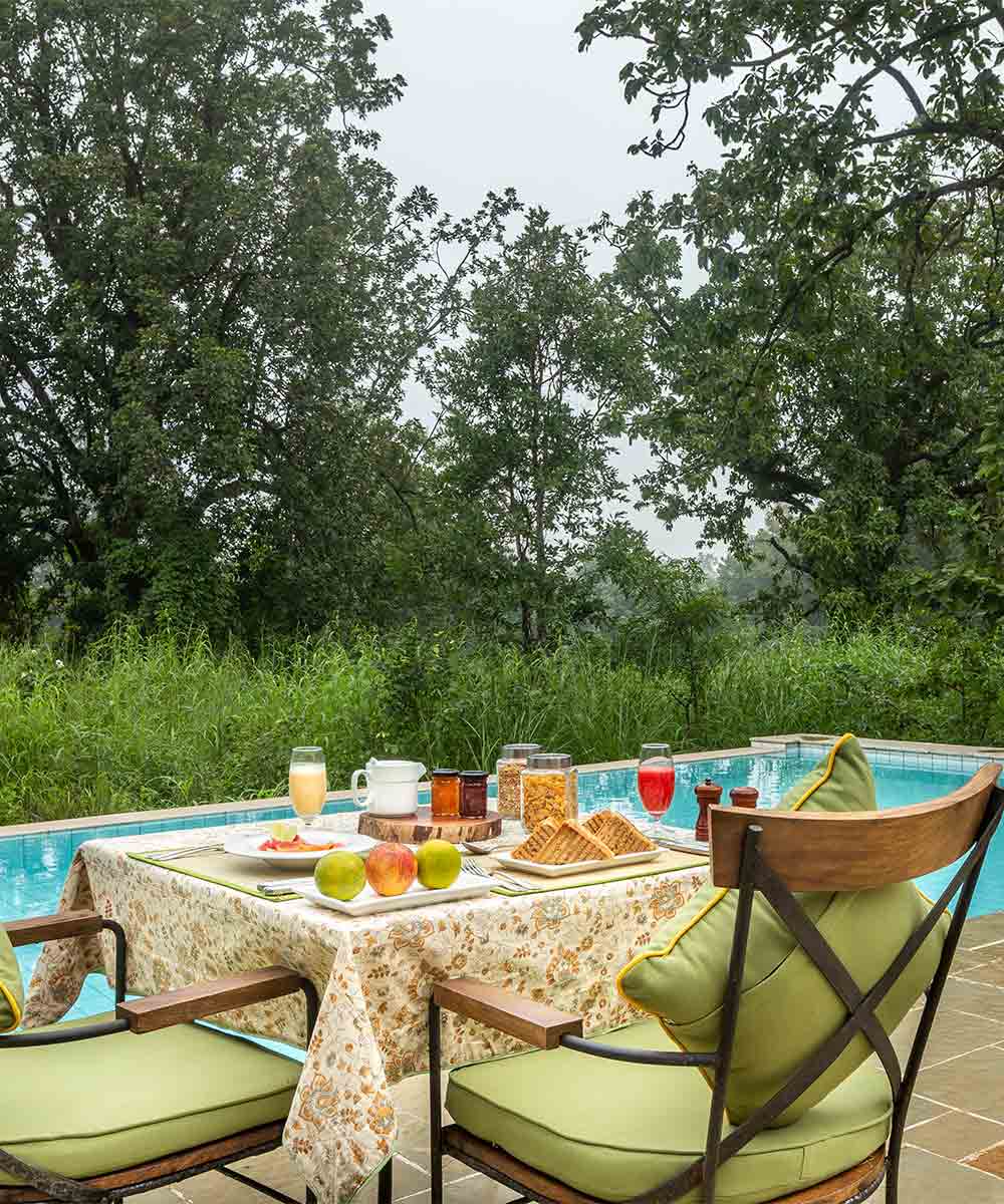 The lodge features a swimming pool, and indoor and outdoor dining spaces. But it’s the wildlife experience that is the main draw here: jeep safaris with knowledgeable guides to uncover the wonders of Pench, walking safaris, cycling trails and birding. The lodge has also built a professional photographic hide, the first of its kind in India, offering an eye level view of birdlife and mammals visiting the waterhole to drink.