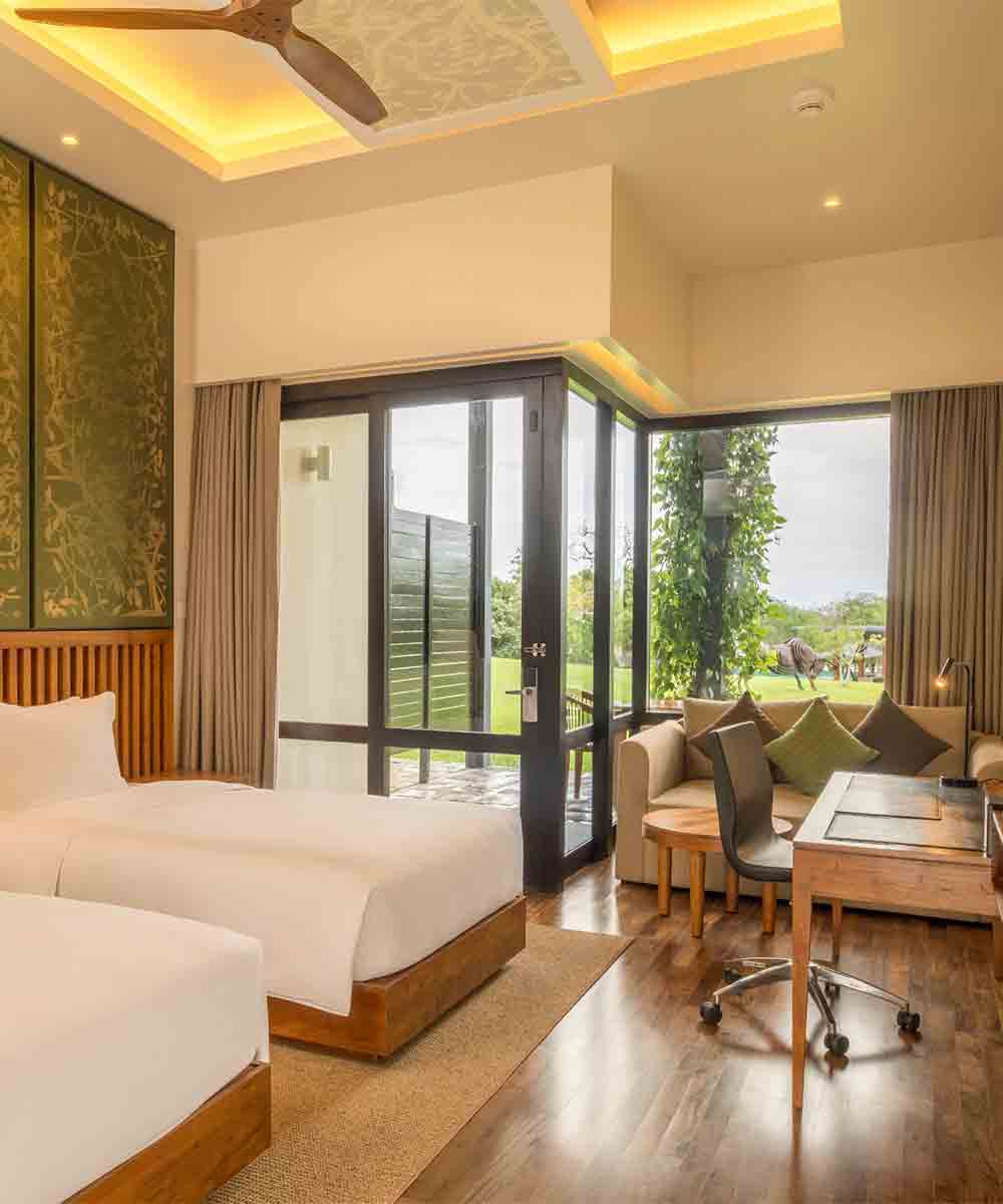 This modern, horseshoe-shaped resort is set on a tranquil promontory, surrounded by lush greenery on the peaceful banks of Weerawila Lake.