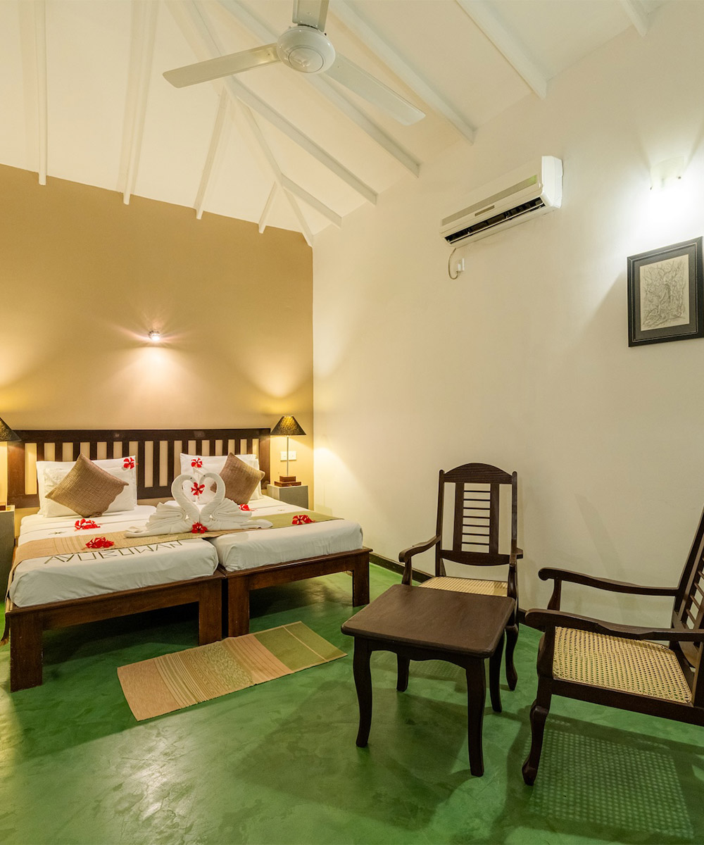 After a day of exploring the region’s cultural and natural wonders, guests can relax by the pool or enjoy a meal at the restaurant, which serves traditional Sri Lankan cuisine. Kassapa Lions Rock combines comfort and cultural immersion, offering a refined base for those seeking to explore Sri Lanka’s fascinating Cultural Triangle. The resort features 51 well-appointed chalets, each offering a spacious air-conditioned bedroom, a private veranda, and an en-suite bathroom equipped with both a bathtub and an open-air hot water shower. In-room amenities include satellite TV, tea/coffee-making facilities, a mini-fridge, and room service for added convenience. Several of the chalets are interconnecting, making them an ideal option for families or groups seeking extra space and proximity.