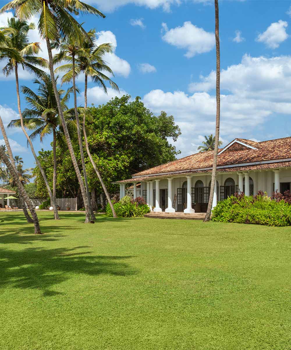 Spread across two acres of beautifully landscaped gardens dotted with swaying palms, the estate enjoys an impressive 200 meters of private ocean frontage. The villa's architecture pays homage to its colonial heritage with soaring ceilings, graceful arches, and wide verandas that blur the line between indoors and out. Inside, sit three refined bedrooms; two with sweeping sea views and one tucked amid the garden, all joined by tastefully curated living and dining spaces, dotted with Sri Lankan art and sculpture.