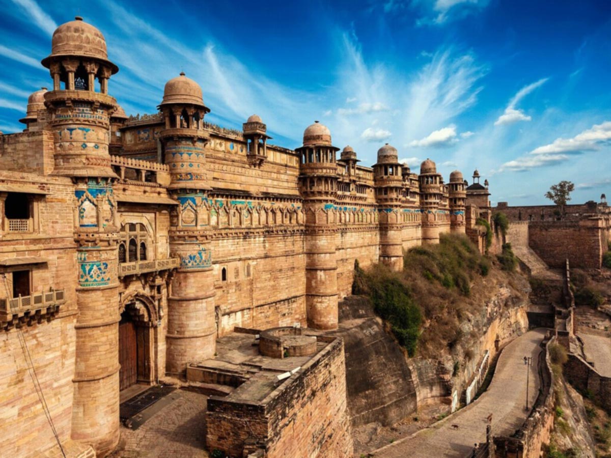 Ascend to one of India's most formidable fortresses, where sandstone walls stretch two miles and rise 35 feet above carved Jain statues embedded in living rock.