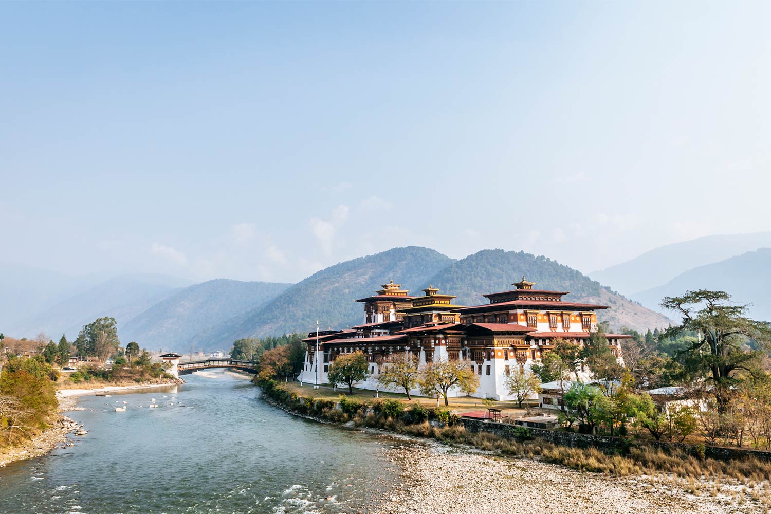 Arrive in Punakha in time to settle into your riverside lodge and enjoy a relaxed lunch amid paddy fields and forested hills. In the afternoon, explore the majestic Punakha Dzong, dramatically positioned at the confluence of the Mo Chhu and Pho Chhu rivers and central to Bhutan’s religious and royal history. Conclude the day with a walk across the Punakha Suspension Bridge, taking in views of the river below, the surrounding valley and village life unfolding on either bank.