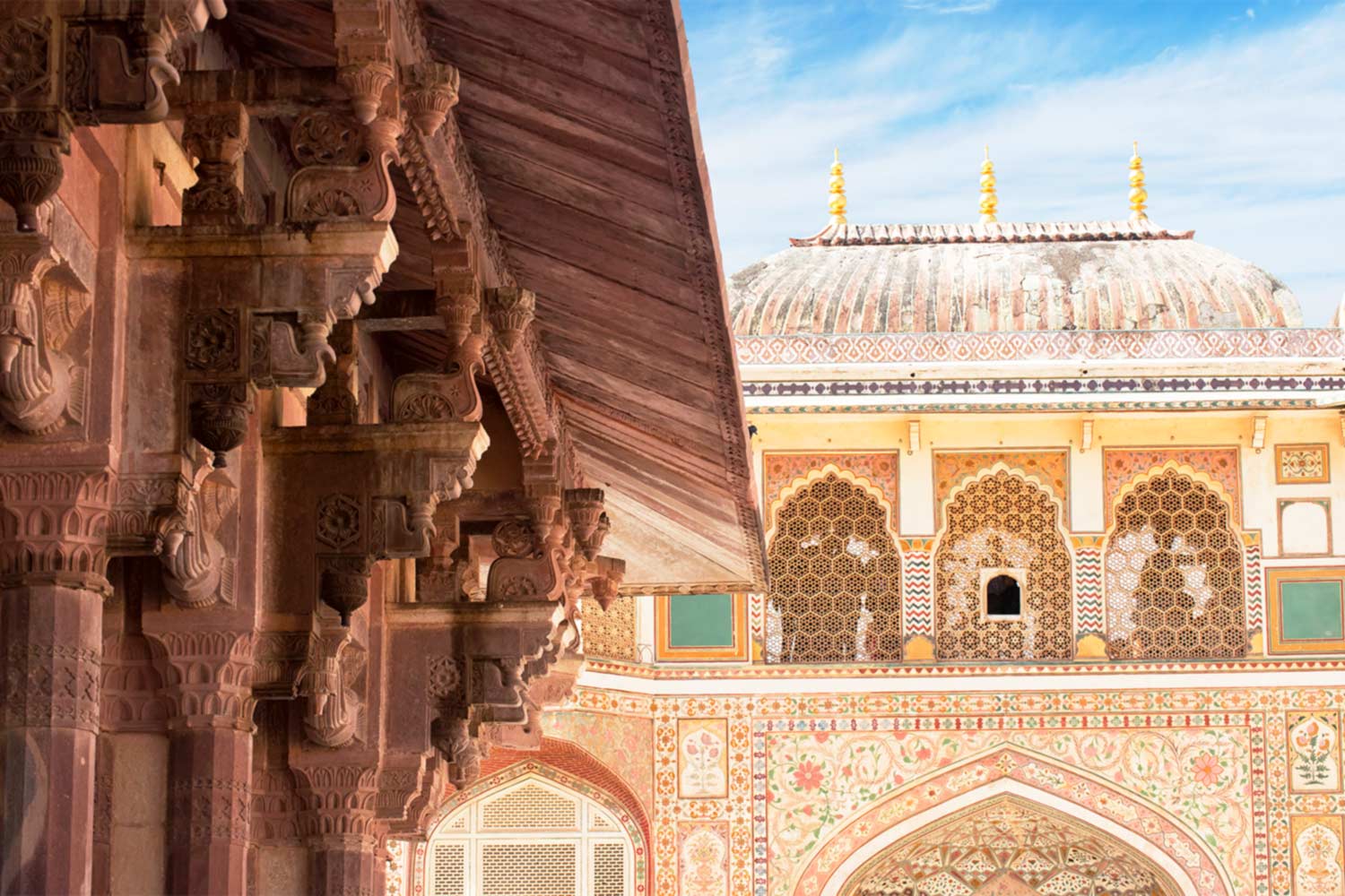 Your day begins quietly, watching the sunrise colours dance across the marble façades of the Taj Mahal and wandering the serene grounds. Then you’re driving to Jaipur, visiting the medieval chasmic stepwell at Abhaneri along the route.