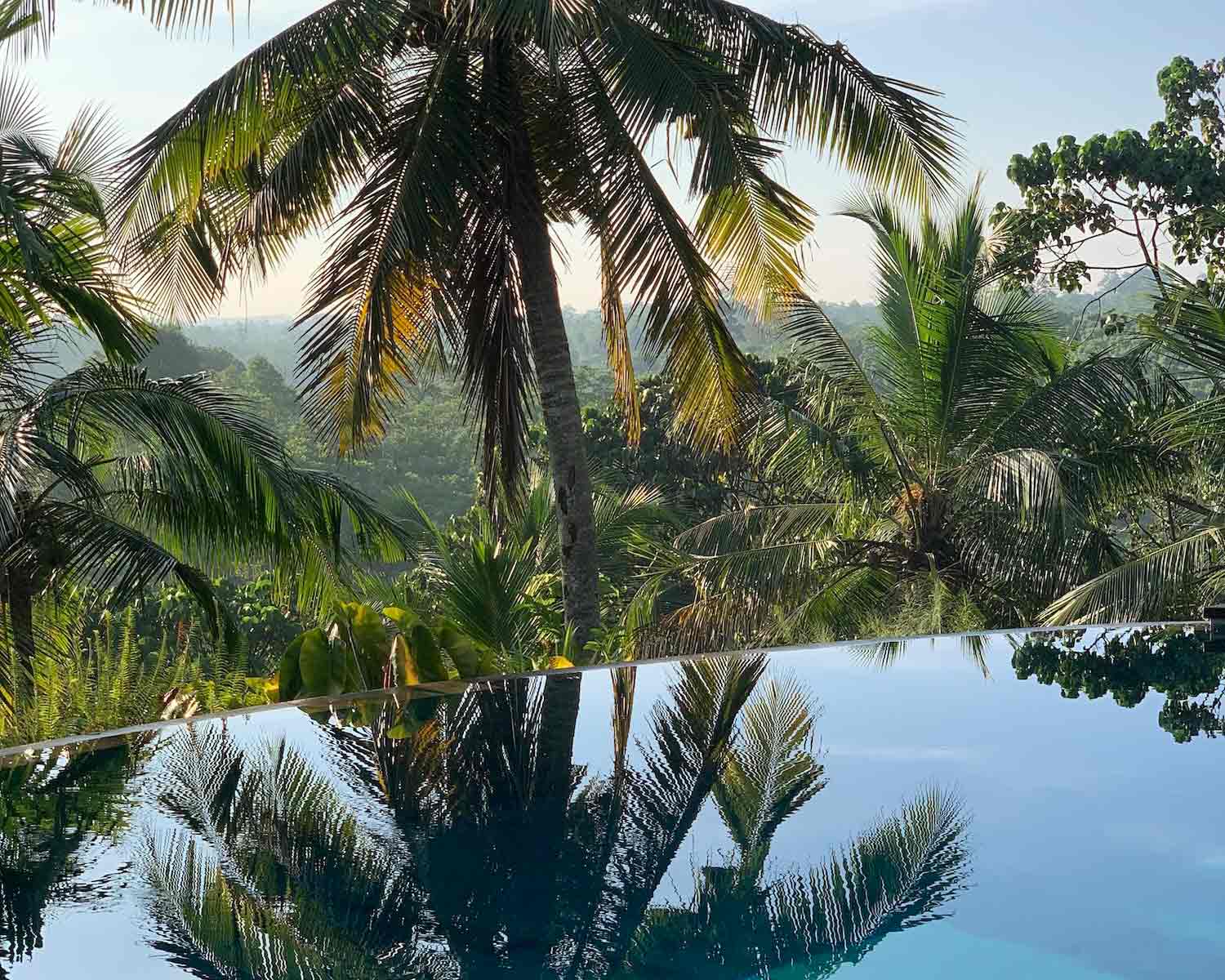 The striking infinity pool becomes the natural centre of the day. In the evening it takes on a different atmosphere altogether. Once it gets dark, fireflies appear around the trees and above the pool, flickering quietly in the warm night air. If you’re lucky you may get to see purple faced langur monkeys as well.