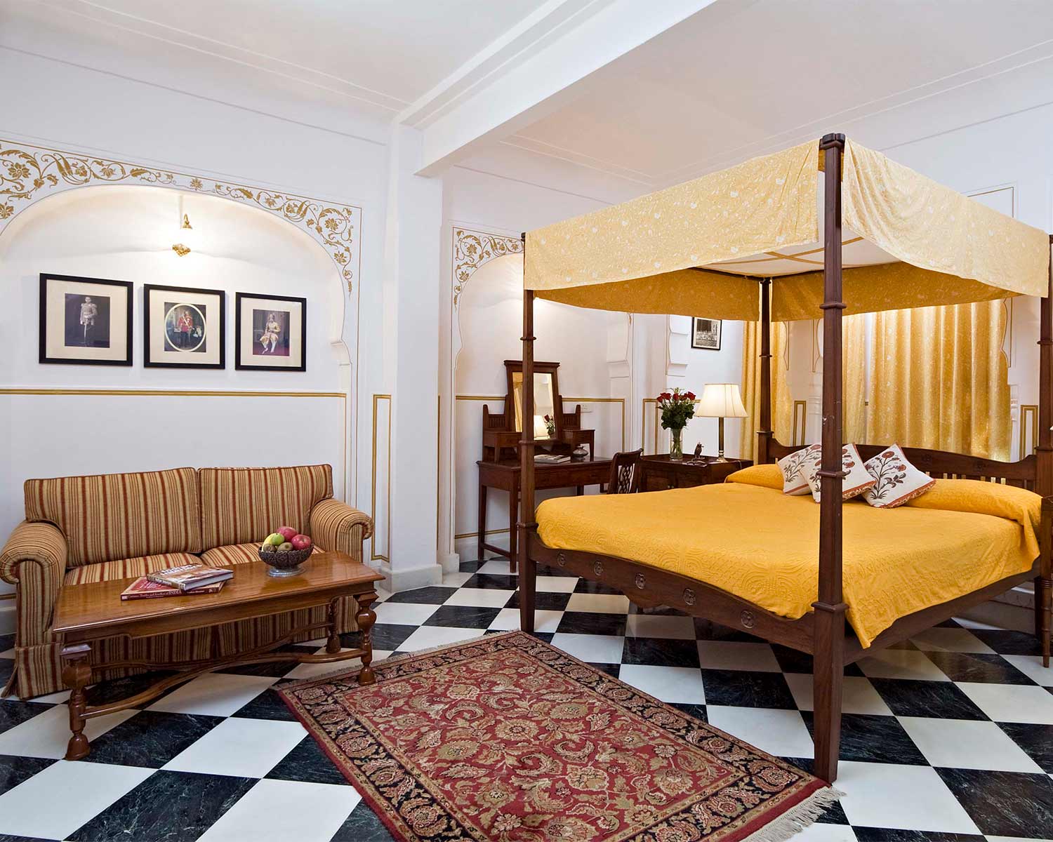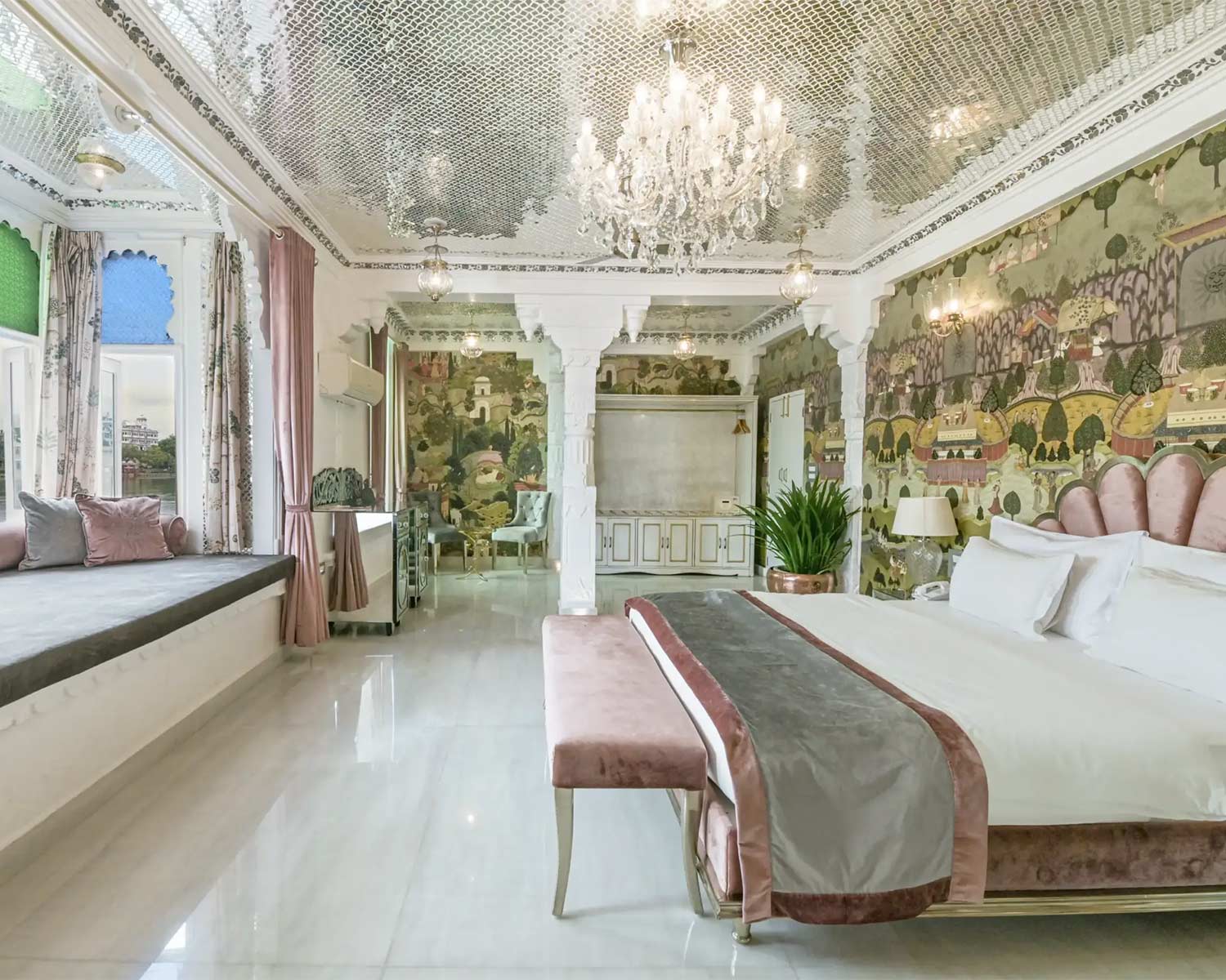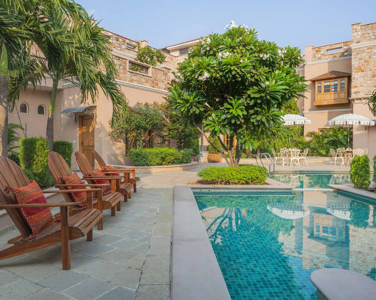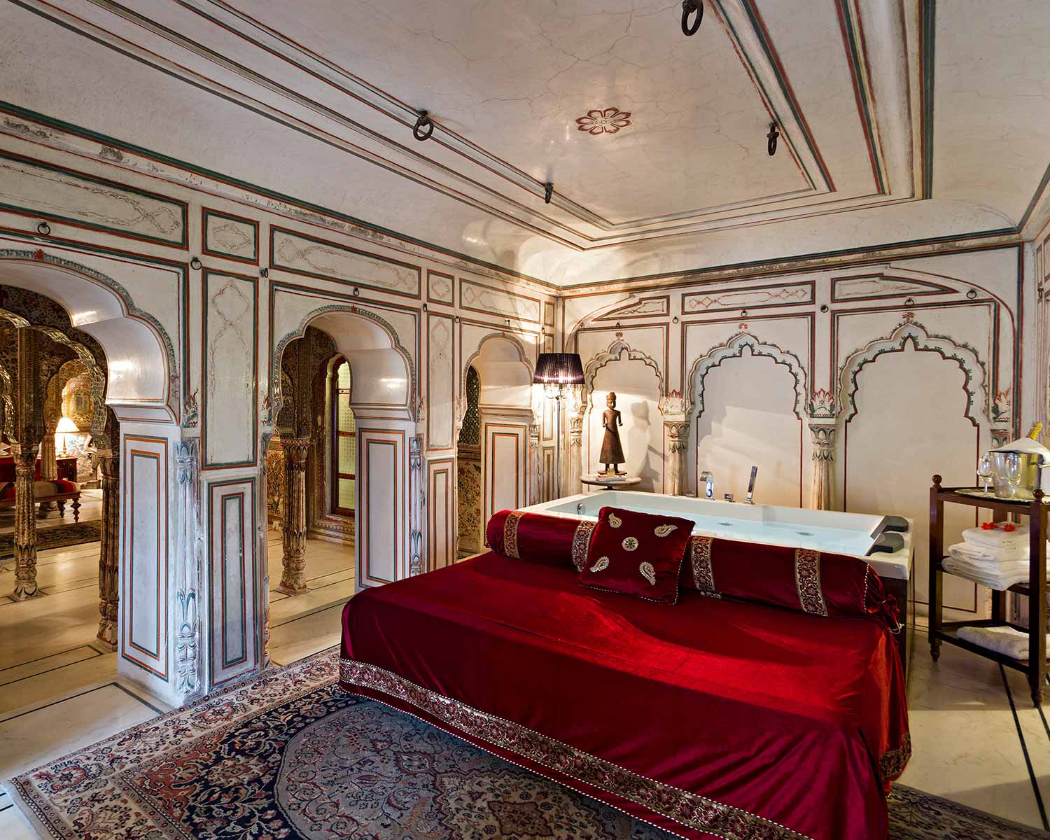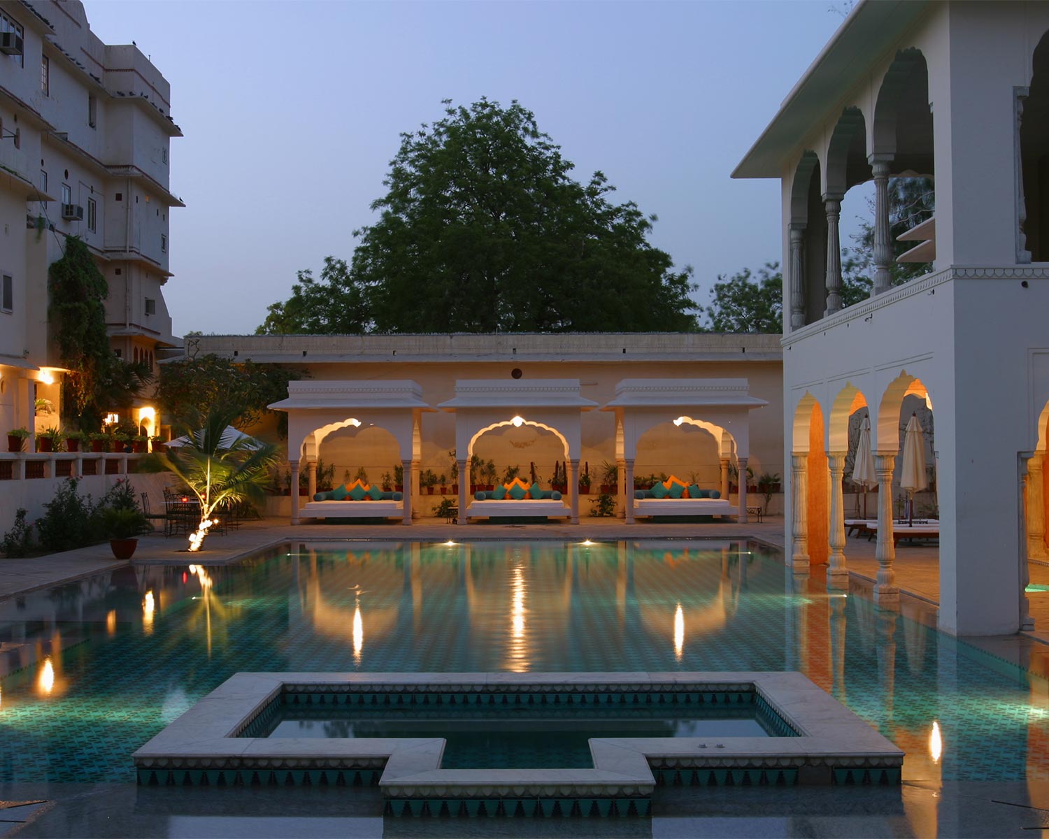 Despite being in the heart of Jaipur, the overwhelming sense here is of a calm retreat; from the tinkling fountain in its central courtyard to its palm-fringed pool and shaded restaurant overlooking the immaculate lawn, it is a haven to use as a base for exploring Jaipur. Rooms are large, high ceilinged and comfortable, set across the breadth of the haveli building, where hand-painted murals, carved doors and mirror mosaics echo the traditional Rajasthani design.