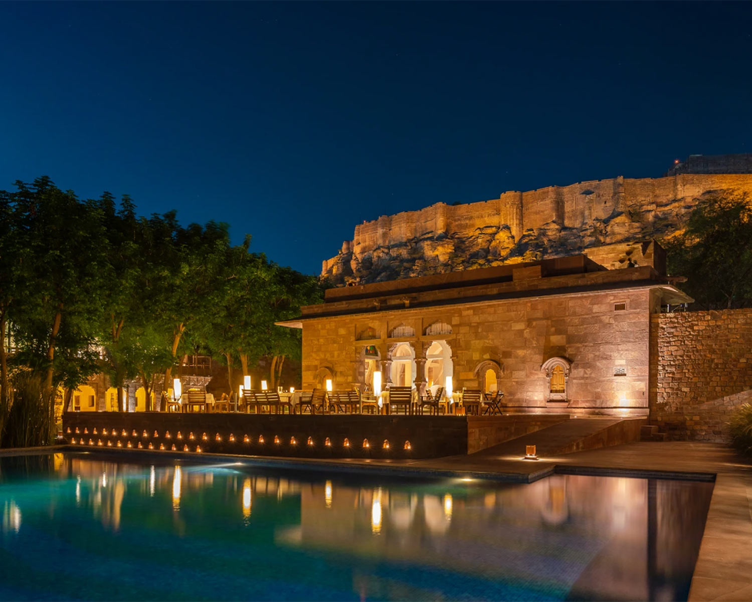 Its location, right in the hub of this ancient blue city, makes for an immersive stay peppered with an oasis-like tranquility within rose-hued sandstone walls. The service is exemplary and dining here at the restored Baradari pavilion, with the ever-present backdrop of the fort, is a notable highlight of any visit to Jodhpur. Rooms are a statement to the iconic design where traditional carved shutters and sweeping arches sit gracefully alongside the sleek, clean lines of contemporary architecture.