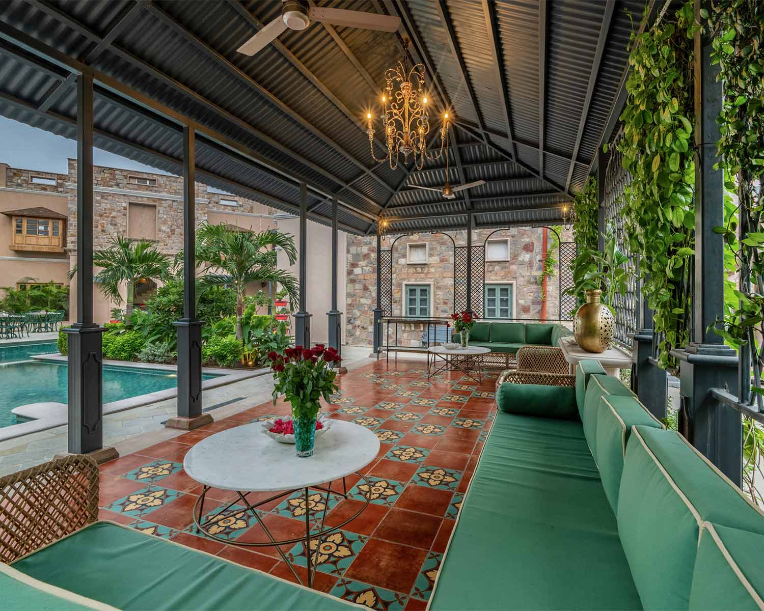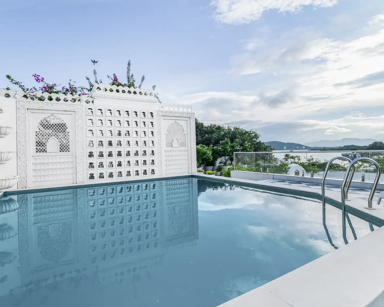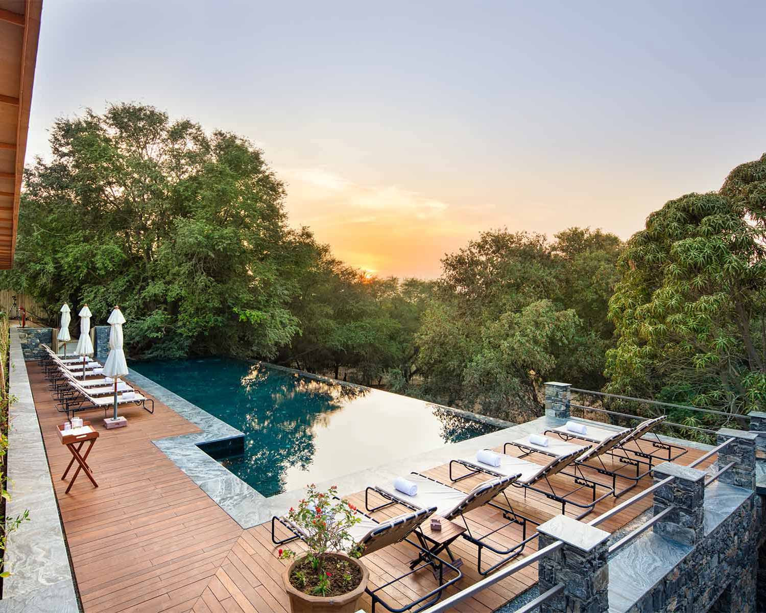 Right on the shores of Lake Pichola in Udaipur, Jagat Niwas is a restored 17th-century heritage haveli that sings of the city’s elegant, white Mewari style architecture. You’ll find jharokha balconies, carved stonework, graceful arches and antique furniture throughout, with an atmosphere that exudes quiet, traditional luxury. Sitting next to the Jagdish Temple and famed City Palace it’s fabulously situated for exploring Udaipur and offers breathtaking reflective views across the lake. Rooms are a temple to calm opulence with chandeliers, carved window seats and gentle palettes of soft pinks and greens echoing the lake outside. The highlight for most guests here is the roof terrace, where the rooftop pool and restaurant are a popular hub for spectacular views. For an intimate dining experience, the hotel also boasts a private boat allowing you to drift across Lake Pichola eating your meal to the atmospheric accompaniment of live traditional music.Sariska Lodge – Sariska Tiger Reserve