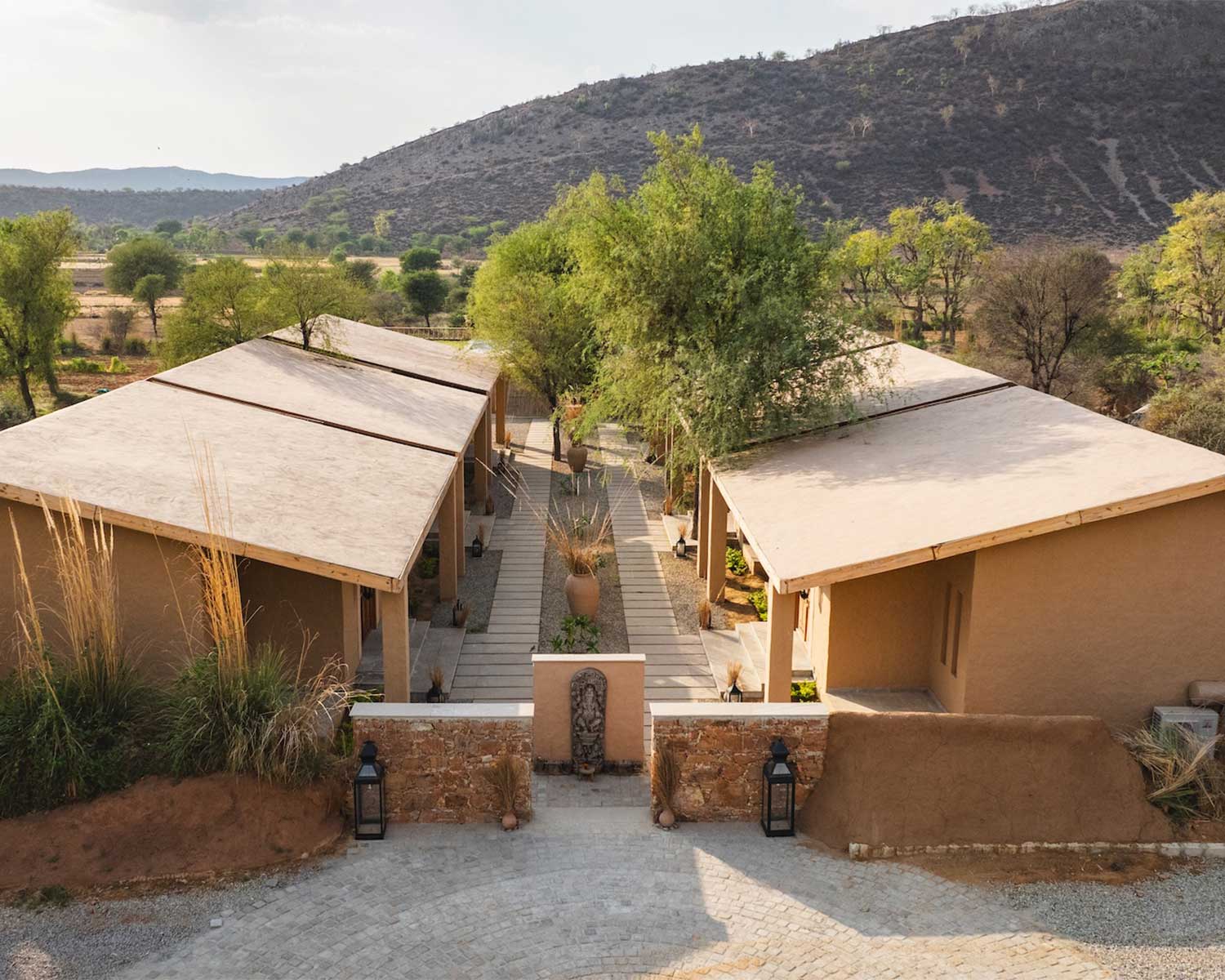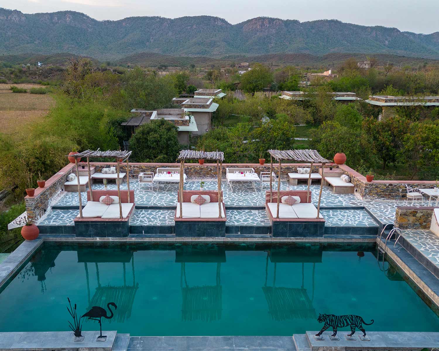 Designed to evoke the atmosphere of traditional forest bothies, Sariska Lodge sits deep in the Aravalli Hills bordering both the Tehla Fort and Sariska Tiger Reserve. It’s a true haven of peace and tranquility where the focus is on slow mindful connection to the bountiful wildlife in these ancient hills. Built using local stone and reclaimed wood, the architecture echoes the regional style with carved jali screens, intricate archways and meandering pathways that lead to serene pools.