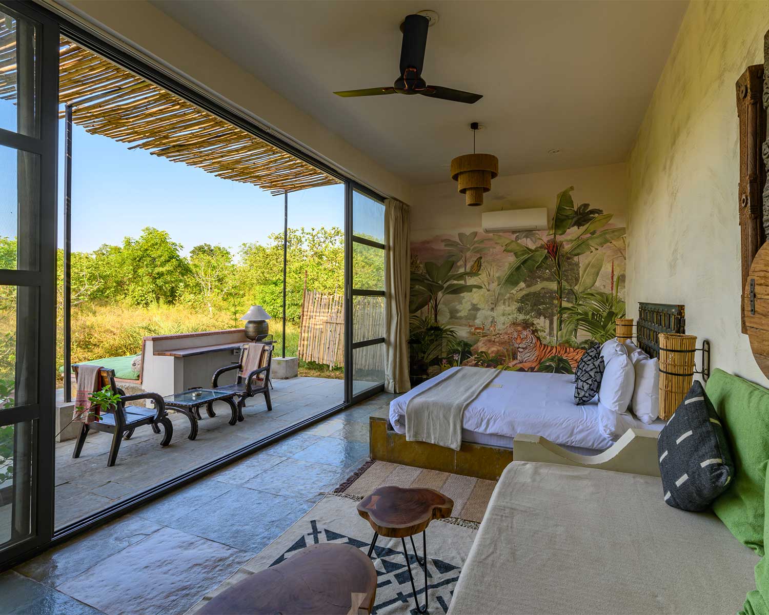 It’s a stay that’s immersed in the mindful connection between place and time, slowing your senses and encouraging a deep pause and appreciation. Farm-to-table cuisine leads the food offering here with ingredients sourced from the hotel’s organic farm and tables dotted between the cattle ranch and the serenity of the farmhouse dining room. Guests are encouraged to get involved in the daily rhythm of the farm ,with classes on organic farming and animal care on offer, alongside bush cooking sessions, morning temple aarti ceremonies and on foot or jeep-based safari adventures.
