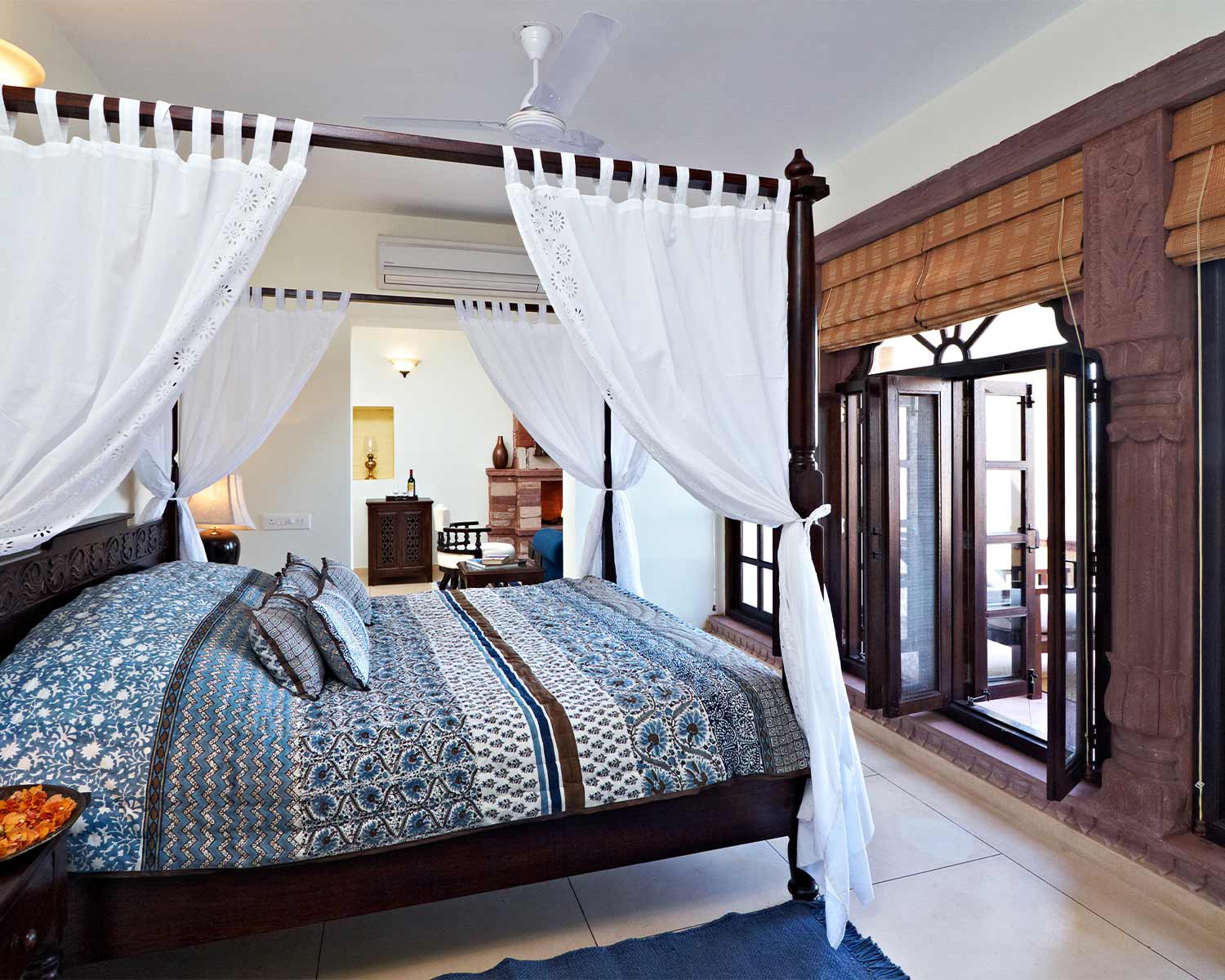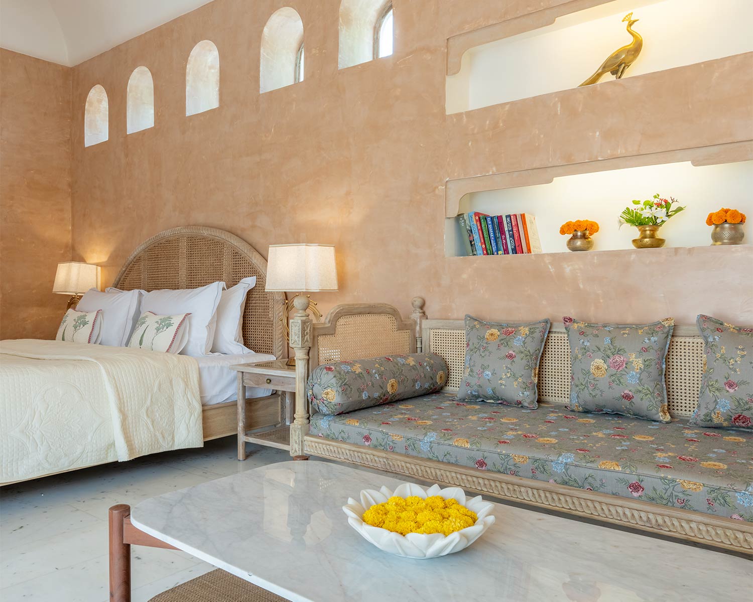 Each of the rooms is uniquely decorated but they all feature calming colour palettes and framed local artworks with large windows overlooking the gardens. The rooftop terrace is a highlight, where you can lounge by the pool, cocktail in hand, and watch the sun set over the neighbourhood rooftops. The hotel makes the most of its setting, offering both heritage walks across central Jodhpur and jeep safaris out to Bishnoi, where you’ll spot the rare black buck antelope as well as tracking chinkara, desert foxes and, between September and March, the migratory Demoiselle Cranes of Guda Lake.