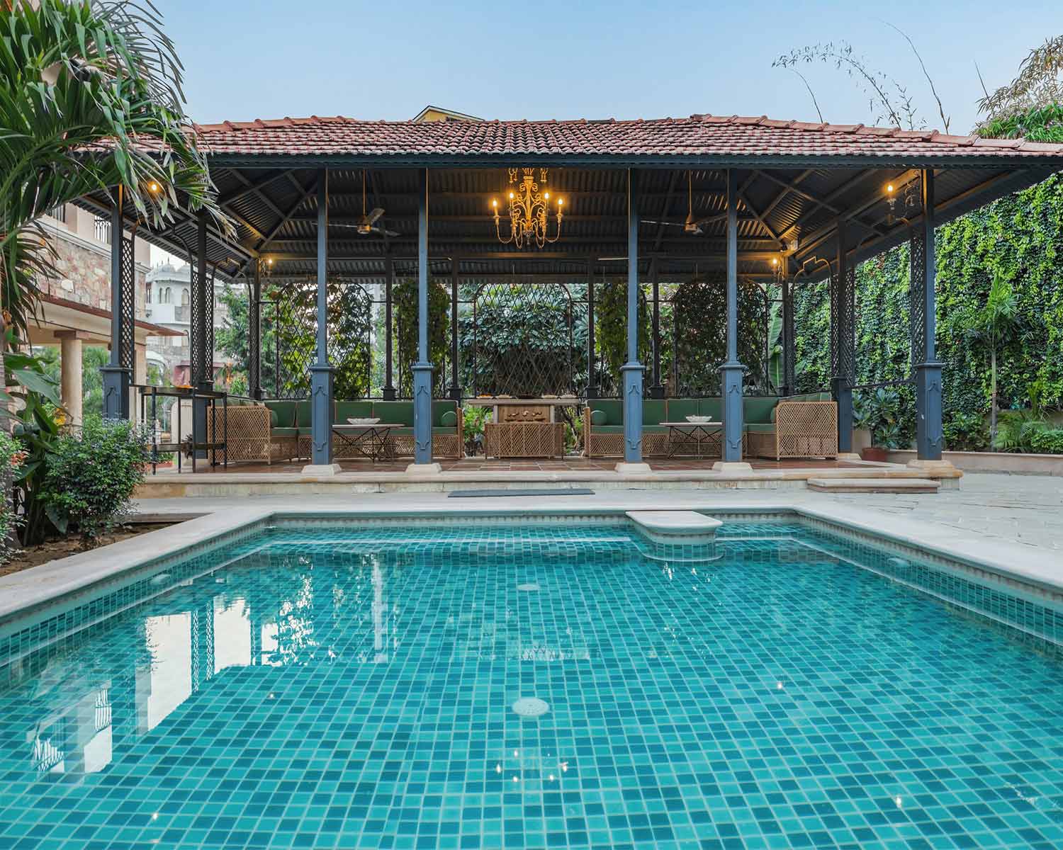A small but perfectly formed boutique hotel just 15 minutes from the centre of Jaipur, Niravi is a sensitively extended former private residence surrounded by stunning tropical gardens that encircle its outdoor pool. The calm, spacious and sun-dappled rooms here are beautifully decorated with hand-painted walls that celebrate the birdlife and planting in the gardens outside.