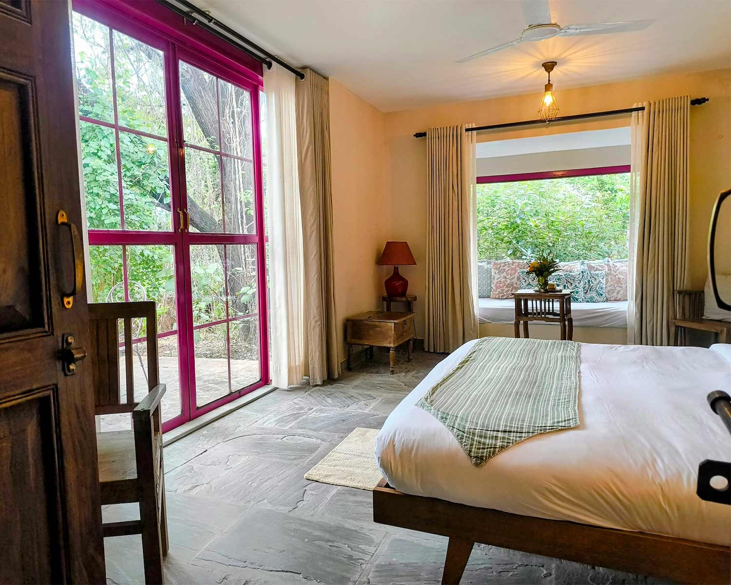 Wandering the garden paths and breathing in the heady scent of frangipani and bougainvillea brings a wonderful counterpoint to a busy day of sightseeing in the pink city. The property manages to exude the relaxed charm of a family home while offering a verdant design-led oasis. The three sisters who own the property are committed to sharing the true Jaipur spirit with their guests and are a font of knowledge and insider tips to those wanting to explore authenticity off the beaten track.